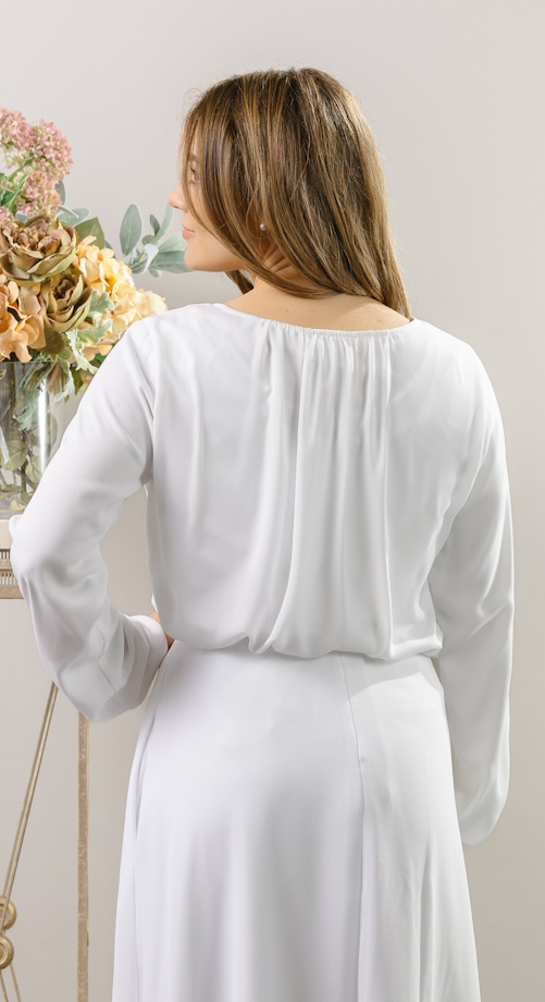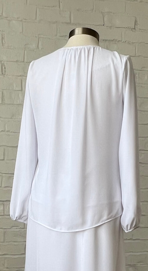Our most versatile blouse yet! A jewel neckline with delicate gathers around a pearl button keyhole to frame your face. Back neckline is also beautifully gathered to create some ease. The sleeve is bell shaped with elastic at the cuff and a simple gather-free cap. We finished it with a curved hem and vents for those who want to wear it out. Wear it with all of our skirts, sweaters, vests and suits — we’ve tried it — it’s perfect for mix and match for LDS Temple clothing, church or work! Fully lined in our softest knit lining.