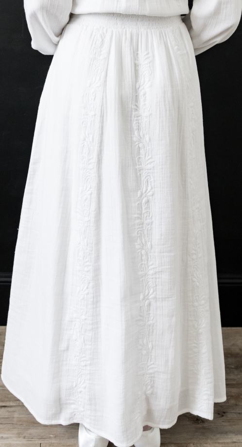 The Barcelona is windowpane patterned 100% cotton gauze, with beautiful leaf and vine embroidery on the sleeves and skirt. Smocked waist