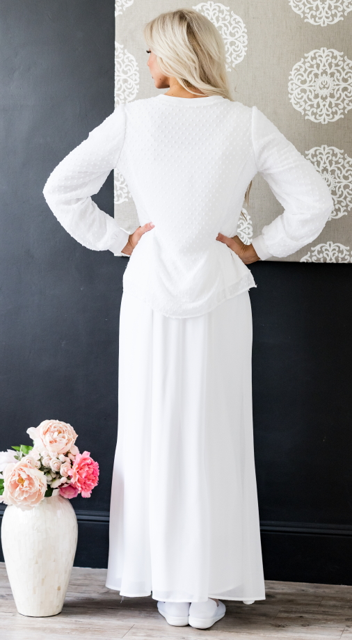 Popcorn chiffon blouse with front buttons and cuff. Fully-lined, slightly fitted. Beautiful, feminine and so versatile with all your white temple skirts. Also great paired with dress pants or skirts for church.