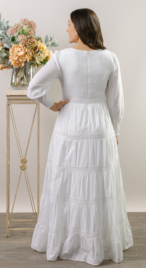 This beautiful dress is made of the finest 100% cotton poplin with a subtle polka dot. Fully lined in the softest 100% cotton knit for breathability. It’s like wearing a luxurious hug. The smocked top has a round neck and natural waist. Gathered sleeve cap is finished with a smocked cuff. Skirt has 4 tiers of poplin divided by a contemporary crocheted lace trim. Back closure includes a 22” zipper and hook and eye at the neck. Such a beautiful option for an LDS Temple dress.