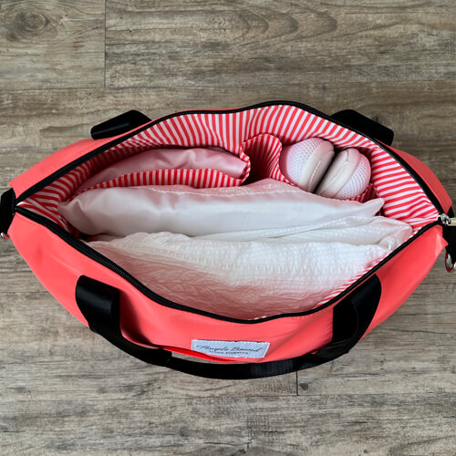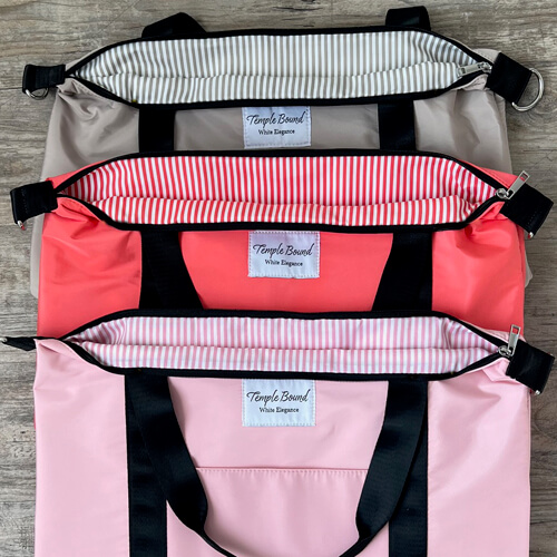Adorable Temple Bound Totes. Hi quality, fully lined in coordinating striped fabric with pockets for shoes, slip, keys, phone. Large enough for all your temple clothing and can fold to store in the locker! Oh, happy day. Comes with attachable shoulder strap and outside snap pocket. The Temple Bound label says it all. Makes a cherished gift with a message. *20″ X 14″ X 6″