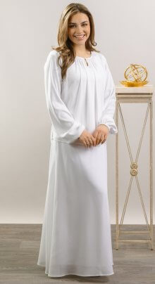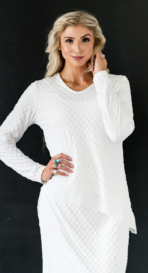 Stockholm Top: Flattering on everyone, a soft, stretch knit top with a diagonal hemline trimmed in 2″ of pebble georgette. Such a perfect addition to your LDS Temple wardrobe or a terrific, easy to wear top with jeans. Shown with Georgette skirt and Shantung A-line skirt.