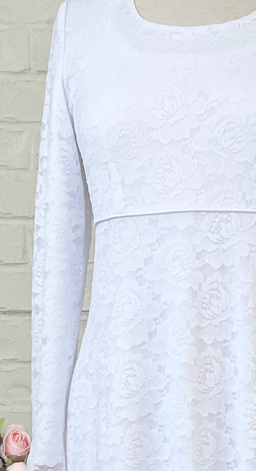 A beautiful new rosey lace in a tried and true White Elegance empire waist style.  Both the lace and lining have stretch to assist in a perfect fit.  Round neck and zipper back with simple straight sleeves. A-line skirt with pockets in the side seams. Raised waist is accented with soft piping.Â
