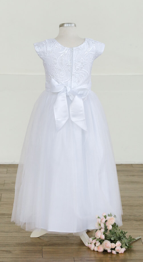 Sequins, embroidery, and organza makes this one of the sweetest in our baptism dress collection. Scalloped lace on bodice is accentuated by a 1″ matte trim with pearl and rhinestone button. Fully lined satin skirt with beautiful ties for a perfect fit. Cap sleeve. Back zipper.