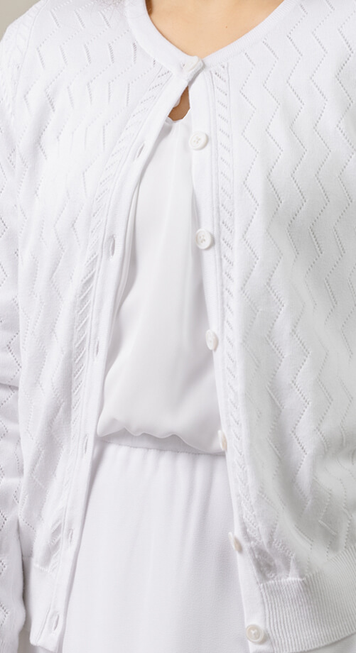 This is a White Elegance office favorite that goes with and over everything. Mix and match with your other white LDS Temple items. A light layer of patterned knitting just perfect for those dodging air conditioning in the summer or foyer doors in the winter.  Traditional fit round neck with a button front placket accented by diagonal patterning.  Hip length cardigan bodice is finished with the same ribbing as the cuffs. Maintains its shape with machine washing and flat drying. Shown with Montecito white blouse.