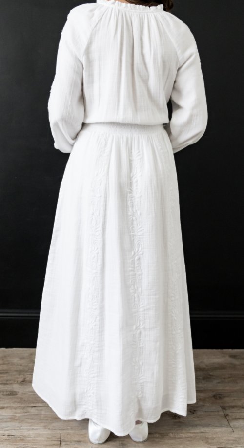 The Barcelona is windowpane patterned 100% cotton gauze, with beautiful leaf and vine embroidery on the sleeves and skirt. Smocked waist