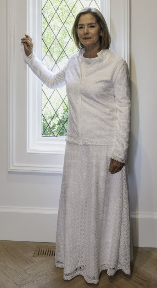 Elastic waist back and flat front waist band. This will be a favorite of LDS Temple workers and patrons. Mix and match with White Elegance coordinating Fortaleza Jacket, Denver Top, Pearl Button Sweater, or Montecito Blouse. Such a great way to extend your LDS Temple wardrobe.