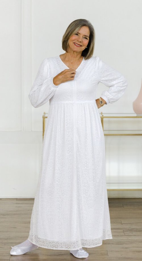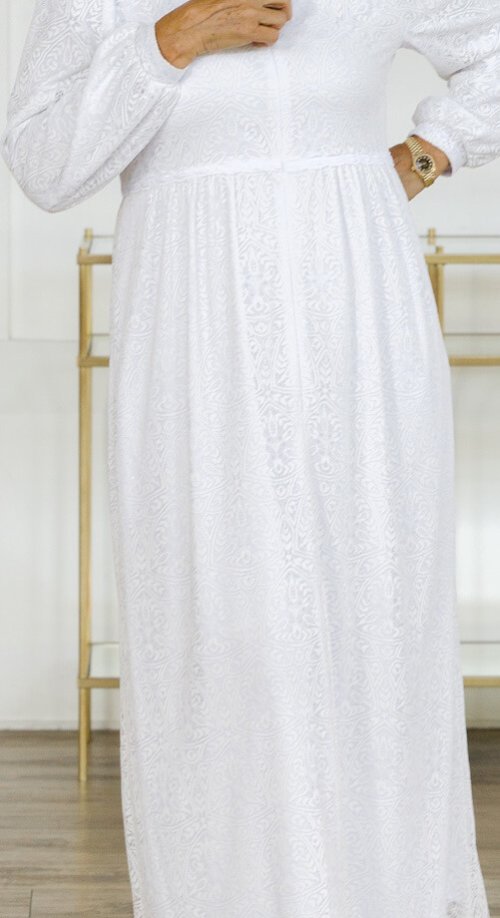 Step into this beautifully unique lace of leaves and three point designs creating this front zip dress. Delicate contrasting trim and gentle shearing at the front and back waist provides just enough forgiveness for an exceptionally comfortable dress. Slight cuff on sleeve is accentuated with coordinating trim.