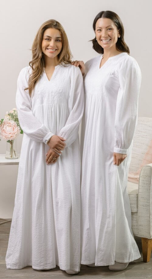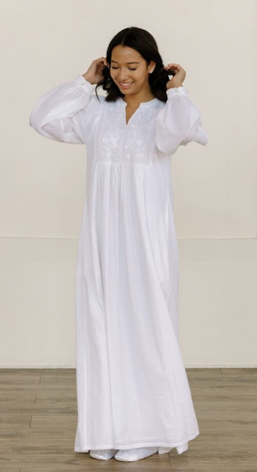 Seersucker!!! White Elegance designer is excited to offer a stunning new lightweight, breathable fabric in a timeless style.  All components are 100% cotton — including the dress lining and embroidery.  Face framing split neck yoke is accented with botanical needlework on the front and across the shoulders in the back.  Keyhole at the back neck for easy over the head dressing.  Generous, unlined raglan sleeves are finished with a functional button cuff complementing this simple cozy beauty for years of enjoyable LDS temple learning.