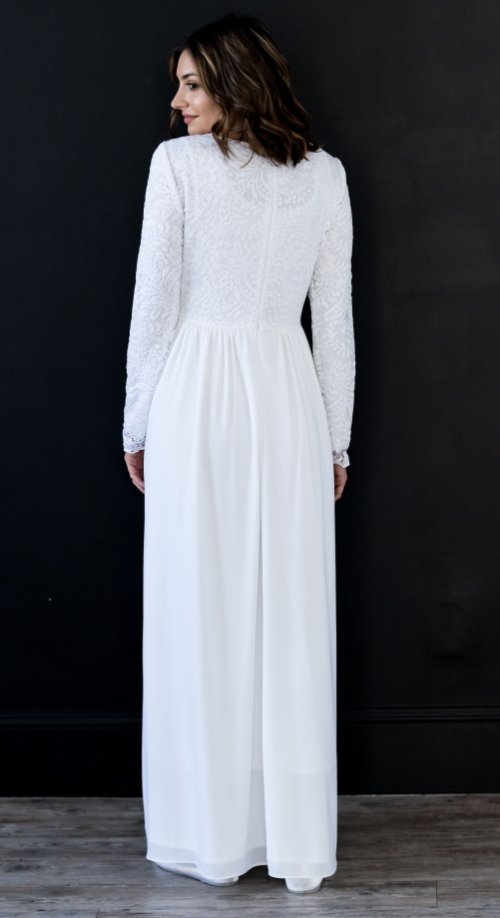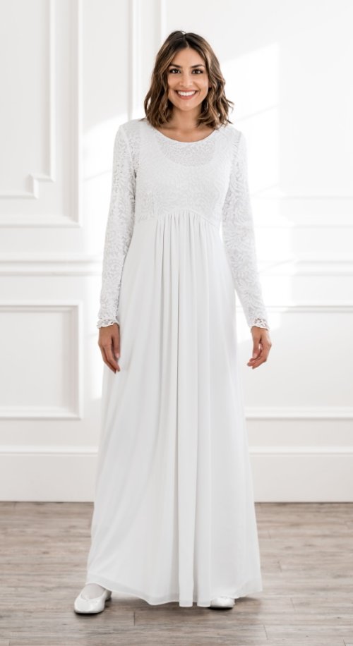 Fully lined dress with raised lace bodice, sheared empire waist, slightly dropped back and beautifully draping soft fabric. Want to add a little pop and sparkle for your wedding day? Simply stitch a few glass beads scattered throughout the bodice then easily remove them to be worn as your perfect Temple dress. Veil Not Included