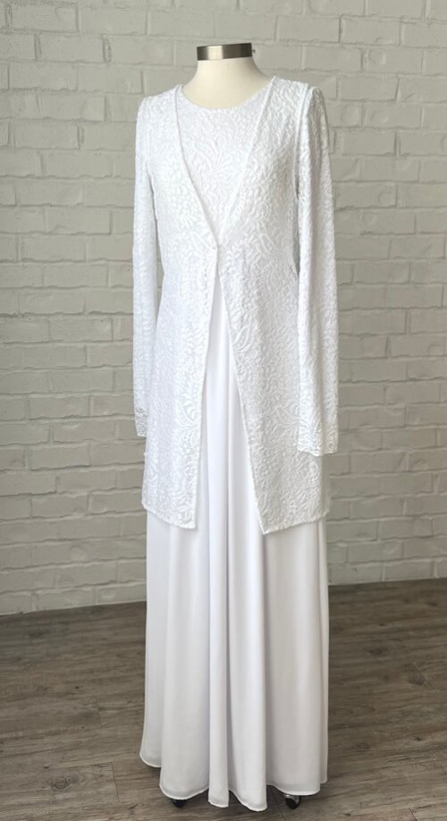 Soft, luxurious raised lace places this white dress in the simply glorious category! Stretch lace bodice front and back with a sweeping skirt of soft doby fabric. Fully lined with opaque denier that makes this dress simply comfortable and flattering. The elongated back creates a slimming silhouette. Careful styling, sizing and the piping at the empire waist make this a favorite LDS Temple dress. Kudos to our White Elegance Design Team! Add a matching vest for a two piece option. Side vents on vest make it easy to reach your two deep side pockets.