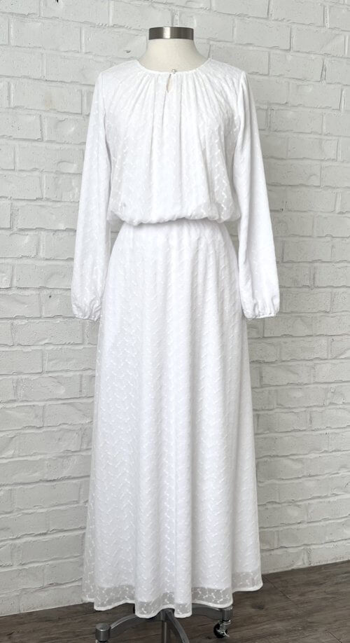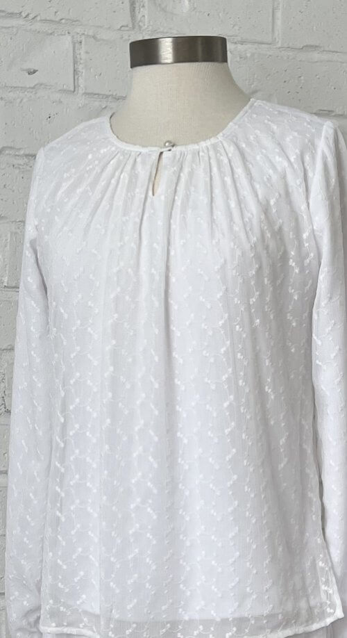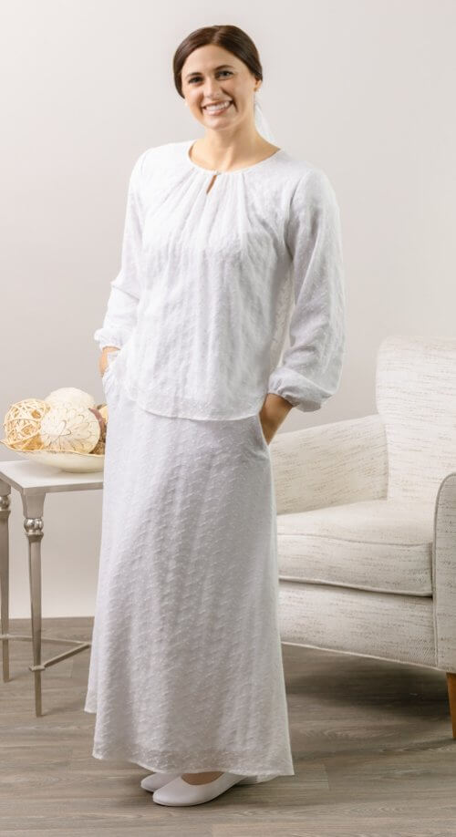 This beautiful, embroidered blouse and skirt will complement a host temple mix and match pieces. Jewel neckline with delicate gathers front and back and a pearl button keyhole make for easy over-the-head dressing. Fully lined in soft knit and vented at the hips for ease, this blouse can be worn beautifully tucked in or left out. Blouson sleeves are finished with narrow elastic at the wrist. Add the Bora Bora three tiered skirt for a mix and match option.