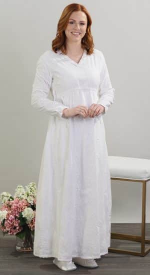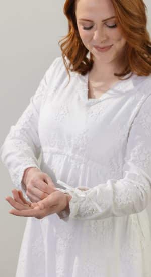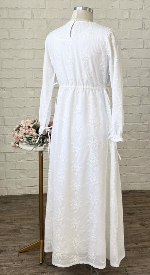 A striking new cotton fabric with floral and vine 3D embroidery is the centerpiece for this simple column style. Fully lined in lightweight cotton. The rounded empire waist is cinchable to your desired fit with functional drawstrings that you can tie into bows (or plain knots) at the sides -- AND for a finishing touch -- cinchable wrist ties that can create a ruffle and bow (if you like bows). V-neck with a keyhole back.