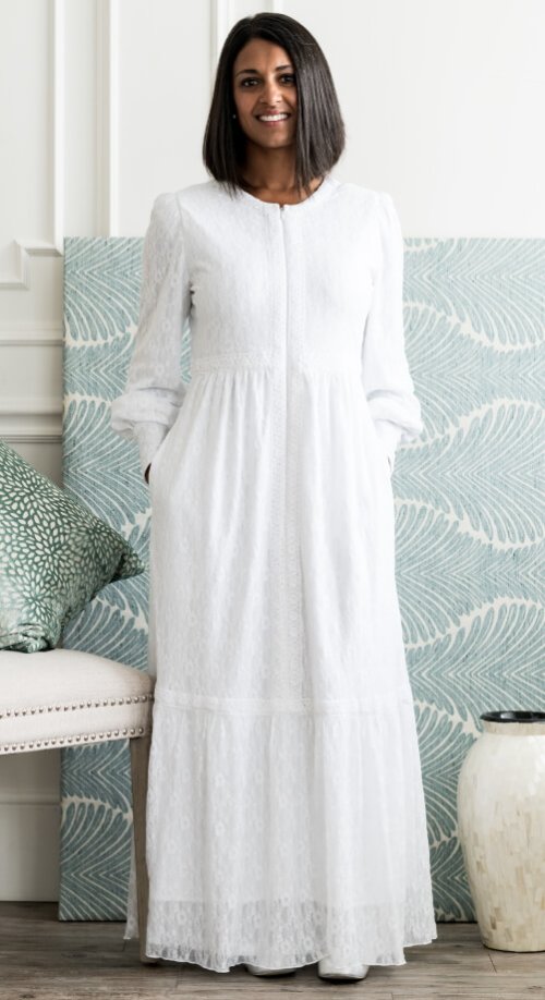 I've been looking for a front closure Temple dress that wasn't cotton for a long time. I love this dress! Doesn't wrinkle, has a discreet front zipper and is beautiful! Petite size is the perfect length for me.