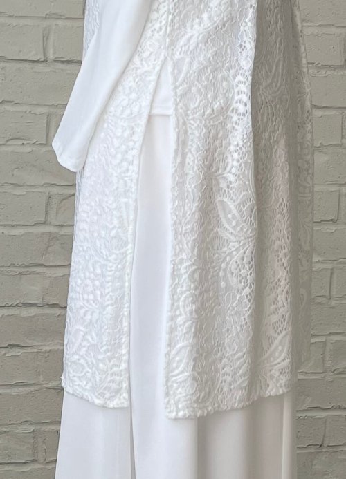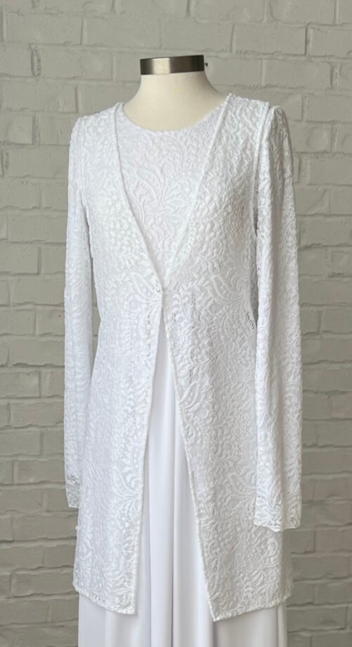 Versatile white lace vest is perfect to spice up your LDS Temple clothing wardrobe. V-neckline, front button closure with side vents allowing access to skirt or dress pockets. Made with White Elegance lace that stands the test of time. Add an optional dress clip on the back for a perfect fit.